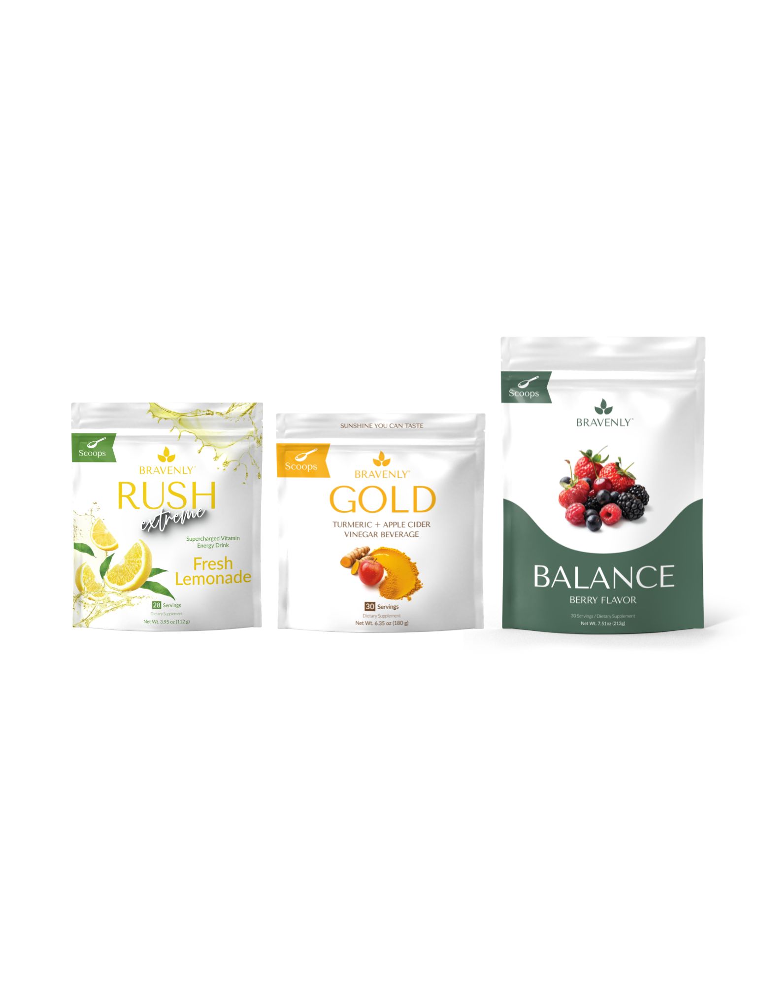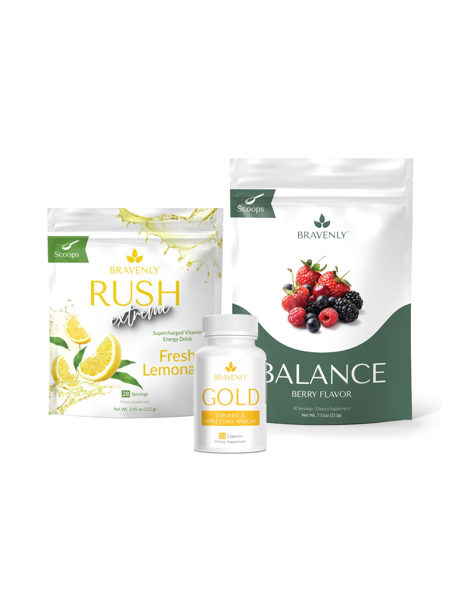 Included: Balance (scoops), Gold (scoops and capsules), and your choice of Rush, Rush Extreme, or Brew Extreme